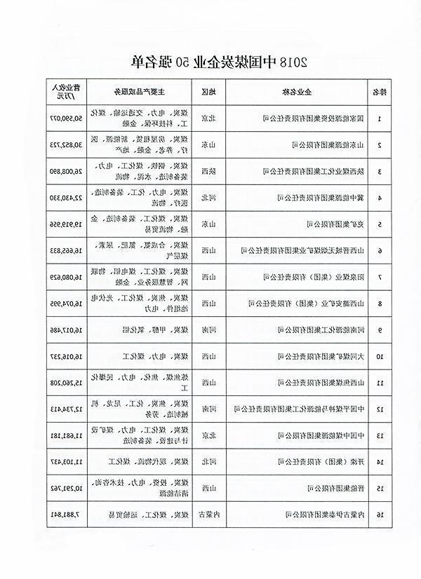2018中国煤炭企业50强名单发布 济宁能源上榜 8月6日,中国煤炭工业协会发布了“中国煤炭企业50强名单”和“中国煤炭产量50强”,我省有山东能源集团、兖矿集团,济宁能源发展集团、鲁泰控股集团四家企业进入两大榜单。 据了解,为推动现代化煤炭经济体系建设,促进行业结构调整与转型升级,提升煤炭行业凝聚力和社会影响力,并为国内外各界提供中国煤炭大企业发展的相关数据与研究信息,中国煤炭工业协会参照国际通行做法,在连续15年发布的基础上,通过企业自主申报与协会统计指标数据相结合的方式,按企业2017年度营业收入为标准排出了2018年中国煤炭企业50强,按照企业2017年度煤炭产量为标准排出了煤炭产量50强。 此次“中国煤炭企业50强名单”中,山东能源集团以3085亿元营业收入列第二位,兖矿集团以1992亿元营业收入列第五位,此外济宁能源发展集团以78亿元列第44位。 同期发布的“中国煤炭产量50强”显示,去年山东能源集团煤炭产量1.4亿吨、兖矿集团1.3亿吨、济宁能源发展集团972万吨、鲁泰控股集团533万吨。(摘自《光明网》)
